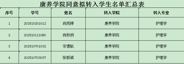 根据《攀枝花学院本科学生转专业实施办法》(攀学院〔2025〕38号)及康养学院转专业实施细则等相关规定,康养学院于2026年3月5日对申请转专业的学生进行了面试。经面试考核及学院学生转专业工作小组讨论审议,现对2026年春季拟同意转专业的学生名单予以公示(名单如下)。
