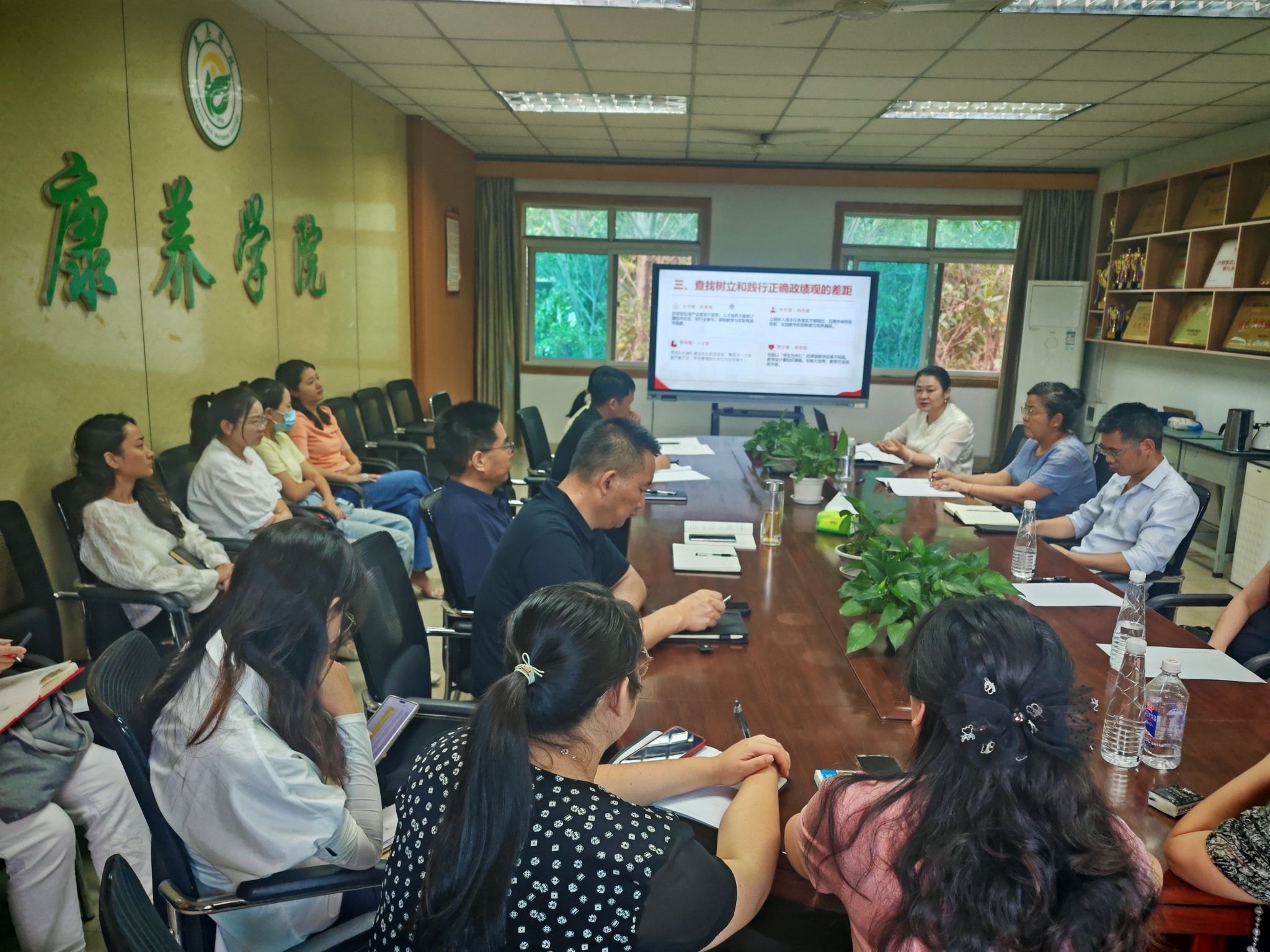 继之,结合学院办学实际,兰玛把自己摆进去,把学院摆进去,全面查摆了目前在办学观、教育观、教师观、教学观、科研观、学生观、服务观、领导观等多方面存在的差距与不足。兰玛指出,康养教育的政绩,应该不在数字报表、不在短期排名,而在为党育人、为国育才的实效;在护佑生命、服务健康的担当;在师生家长满意、长远发展的口碑。全体党员教师要以榜样为镜,坚定理想信念、坚持人民至上、勇于担当作为、甘于无私奉献,把正确政绩观转化为育人实干行动。